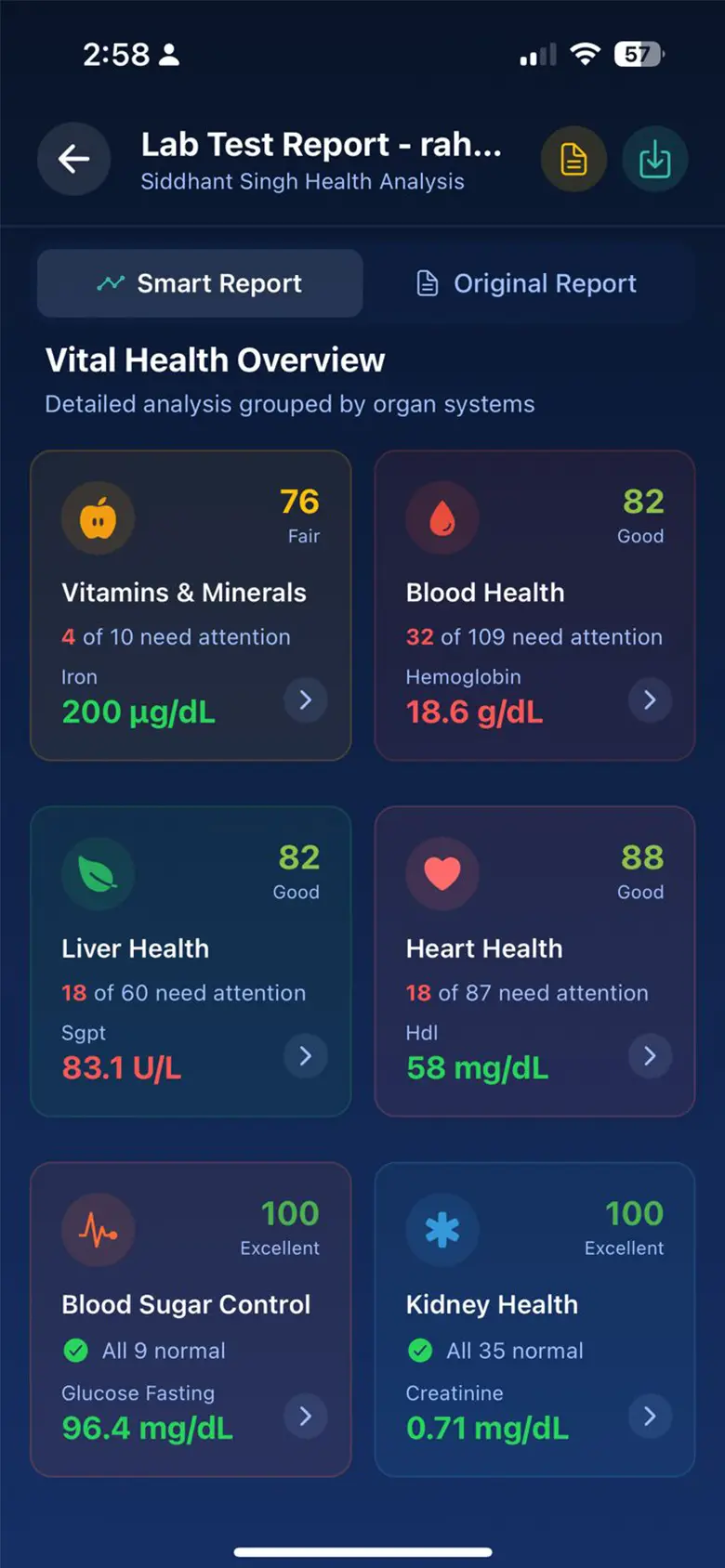 Never lose a medical report again. Get personalized health insights, track vital changes over time, and share records with doctors instantly when needed.